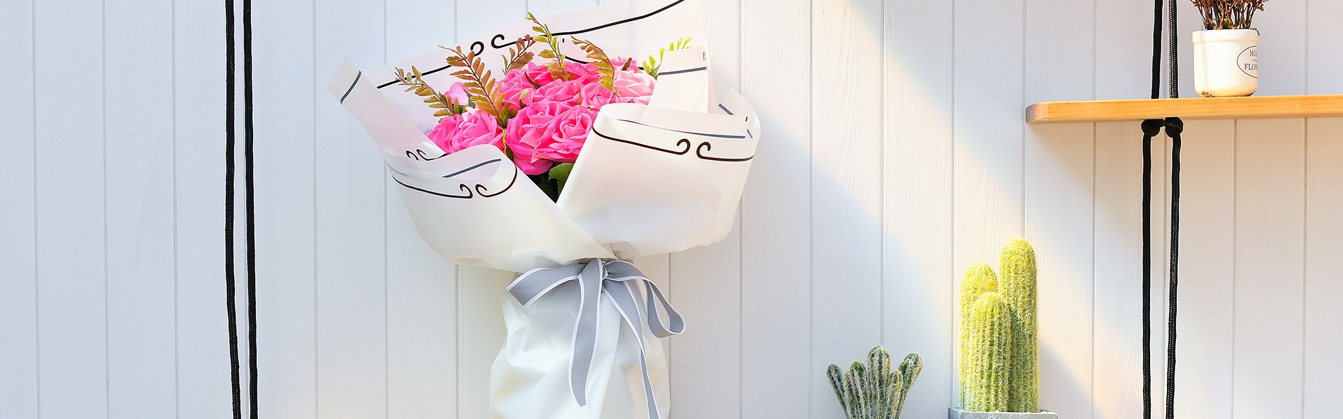 Paquete de rollo de 57cm * 10Y, fábrica gruesa en Stock, venta al por mayor, papel de regalo de flores mate impermeable, materiales de embalaje florales